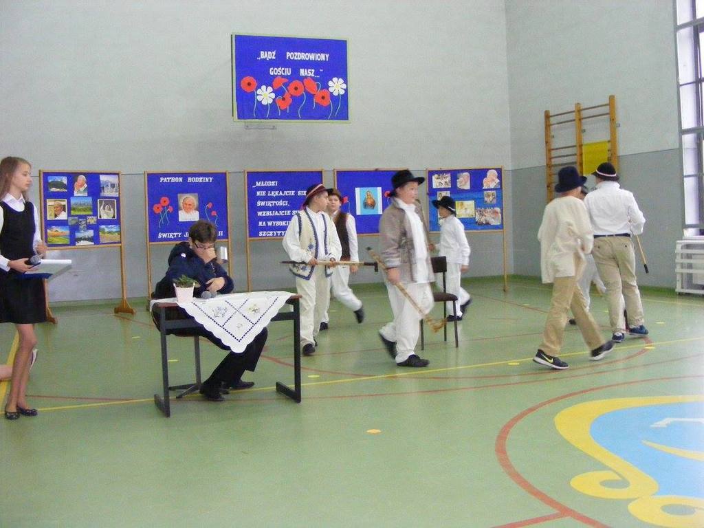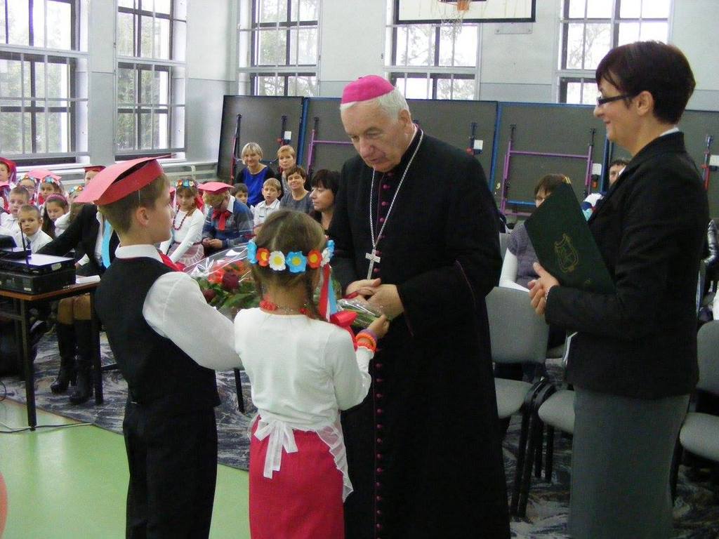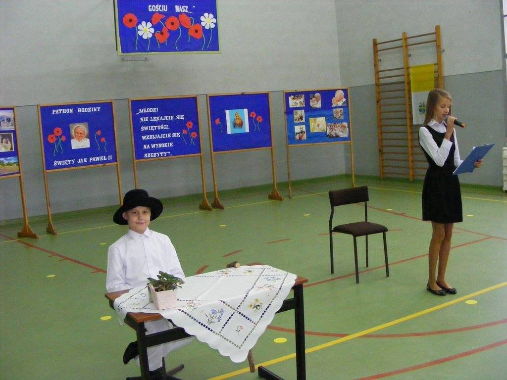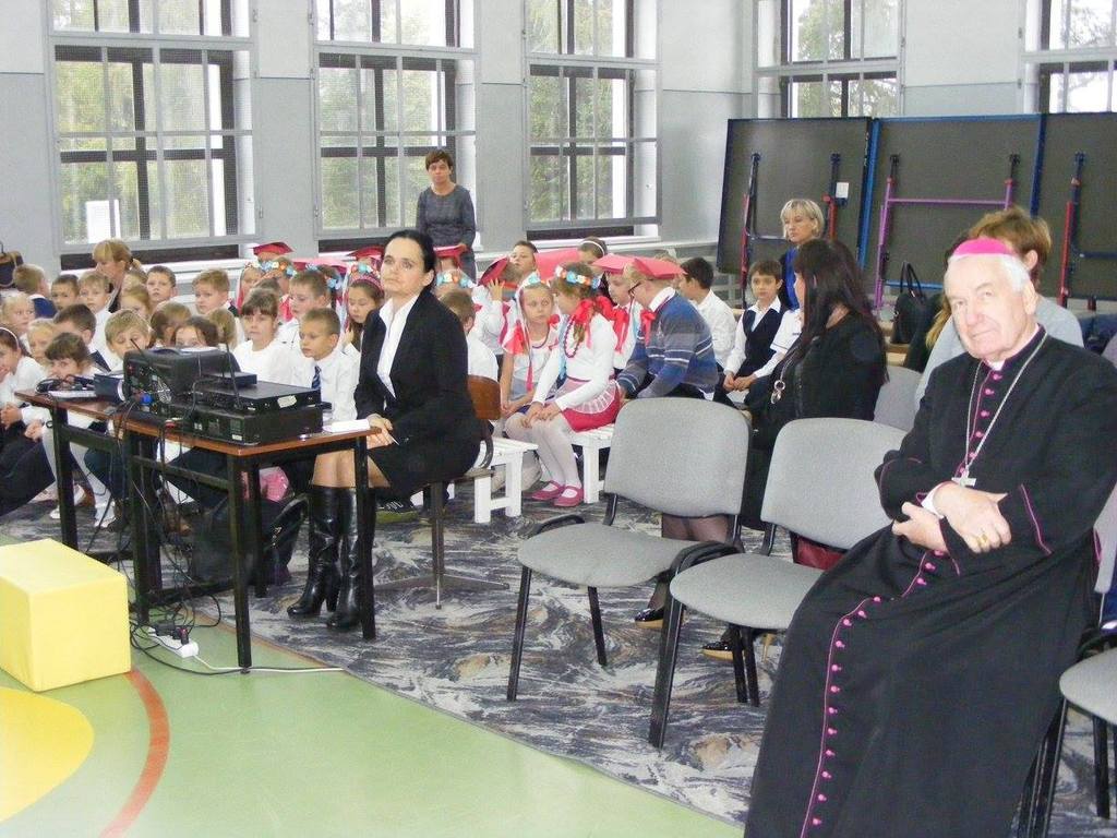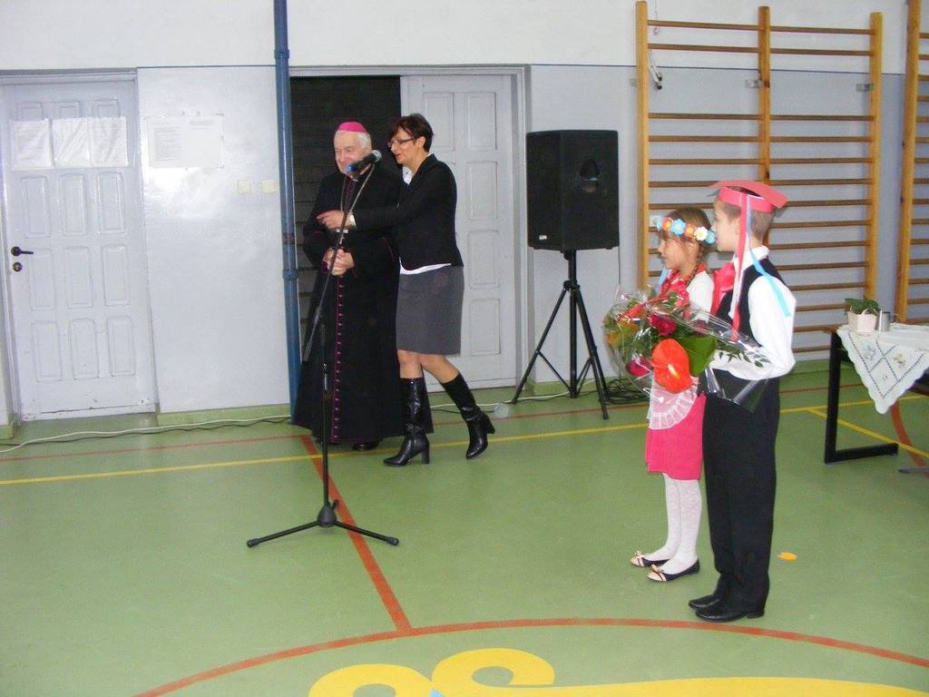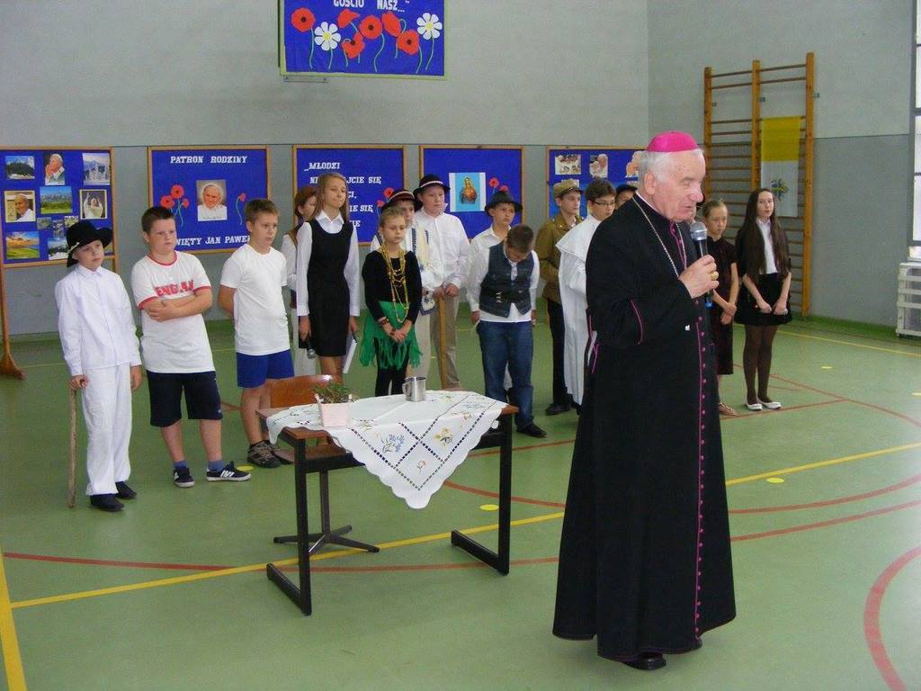 KSIĄDZ BISKUP WYSŁUCHAŁ PROGRAMU ARTYSTYCZNEGO, W KTÓRYM UCZNIOWIE PRZEDSTAWILI BIOGRAFIĘ I PRZESŁANIE ŚWIĘTEGO JANA PAWŁA II. NASTĘPNIE KSIĄDZ BISKUP ZWRACAJĄC SIĘ DO ZEBRANYCH PODKREŚLIŁ JAK WAŻNE W DZISIEJSZYCH CZASACH JEST WYCHOWANIE I UCZENIE MŁODEGO POKOLENIA WIARY,TRADYCJI ORAZ MIŁOŚCI DO DRUGIEGO CZŁOWIEKA.