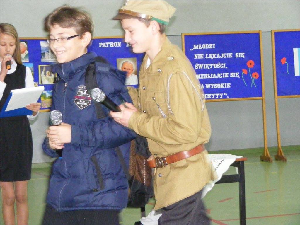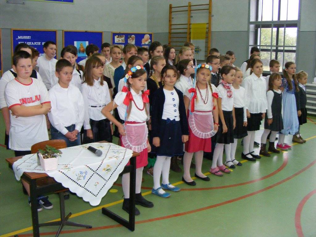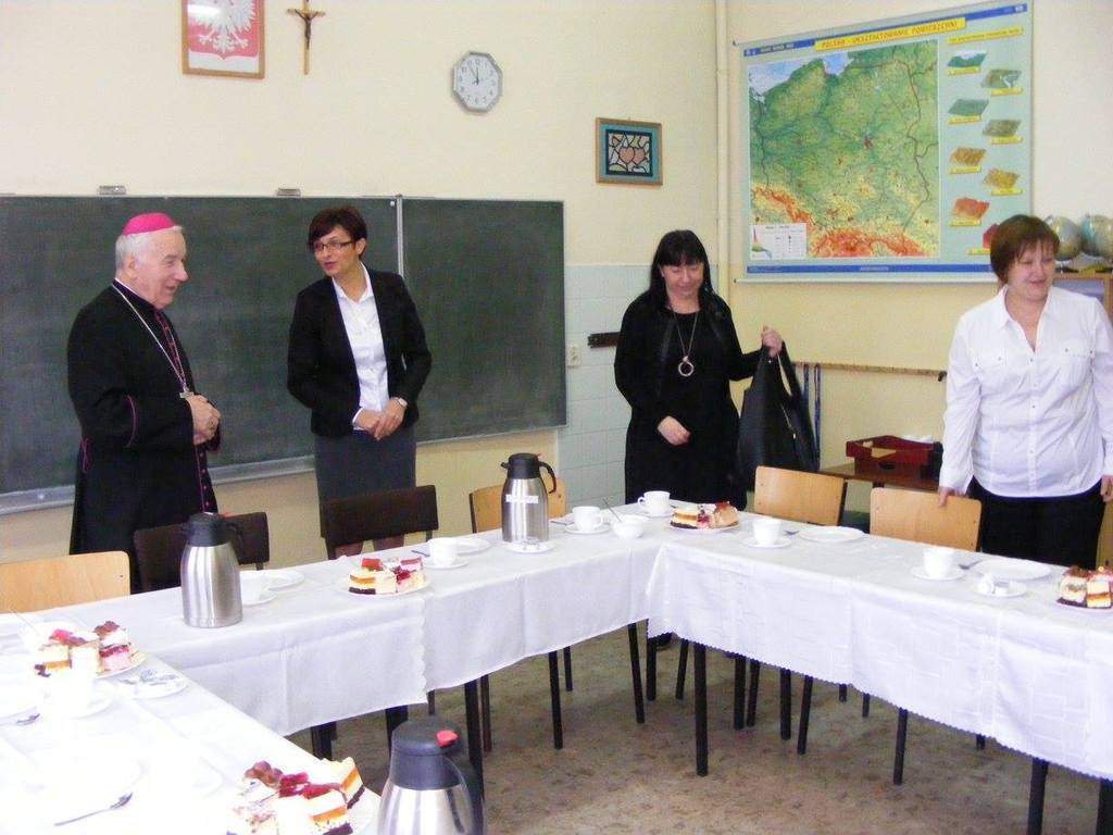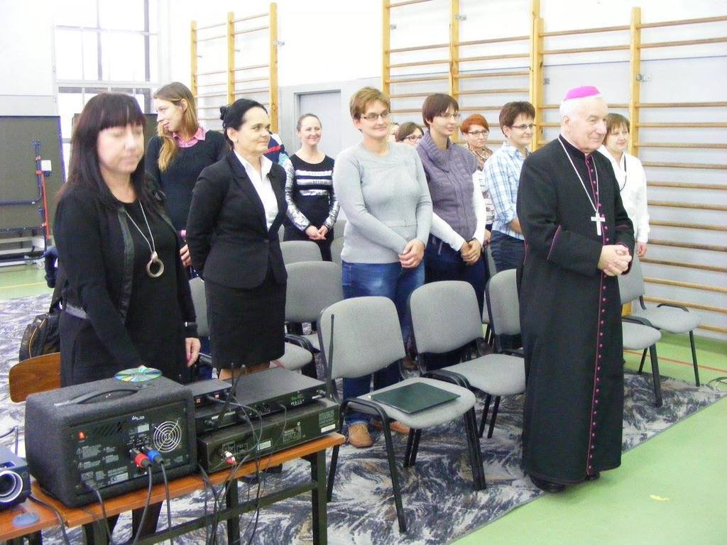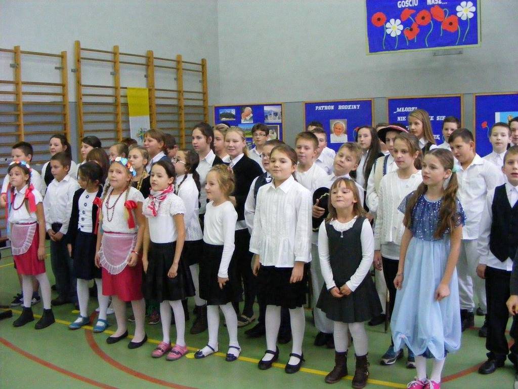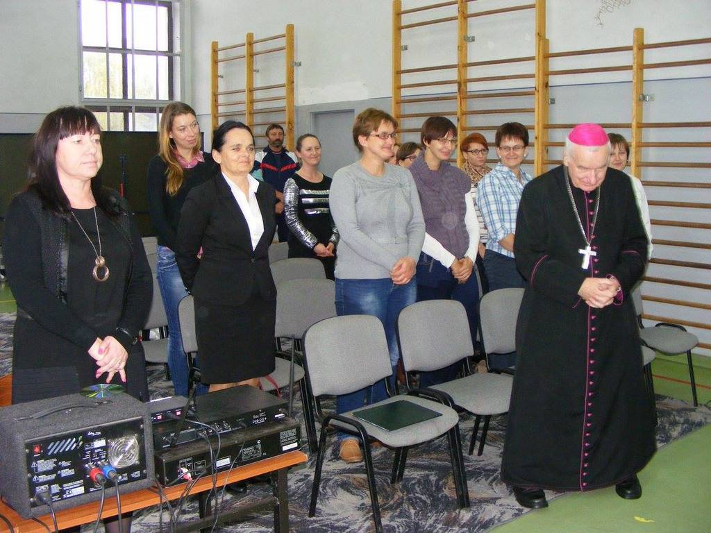KSIĄDZ BISKUP WYSŁUCHAŁ PROGRAMU ARTYSTYCZNEGO, W KTÓRYM UCZNIOWIE PRZEDSTAWILI BIOGRAFIĘ I PRZESŁANIE ŚWIĘTEGO JANA PAWŁA II. NASTĘPNIE KSIĄDZ BISKUP ZWRACAJĄC SIĘ DO ZEBRANYCH PODKREŚLIŁ JAK WAŻNE W DZISIEJSZYCH CZASACH JEST WYCHOWANIE I UCZENIE MŁODEGO POKOLENIA WIARY,TRADYCJI ORAZ MIŁOŚCI DO DRUGIEGO CZŁOWIEKA.