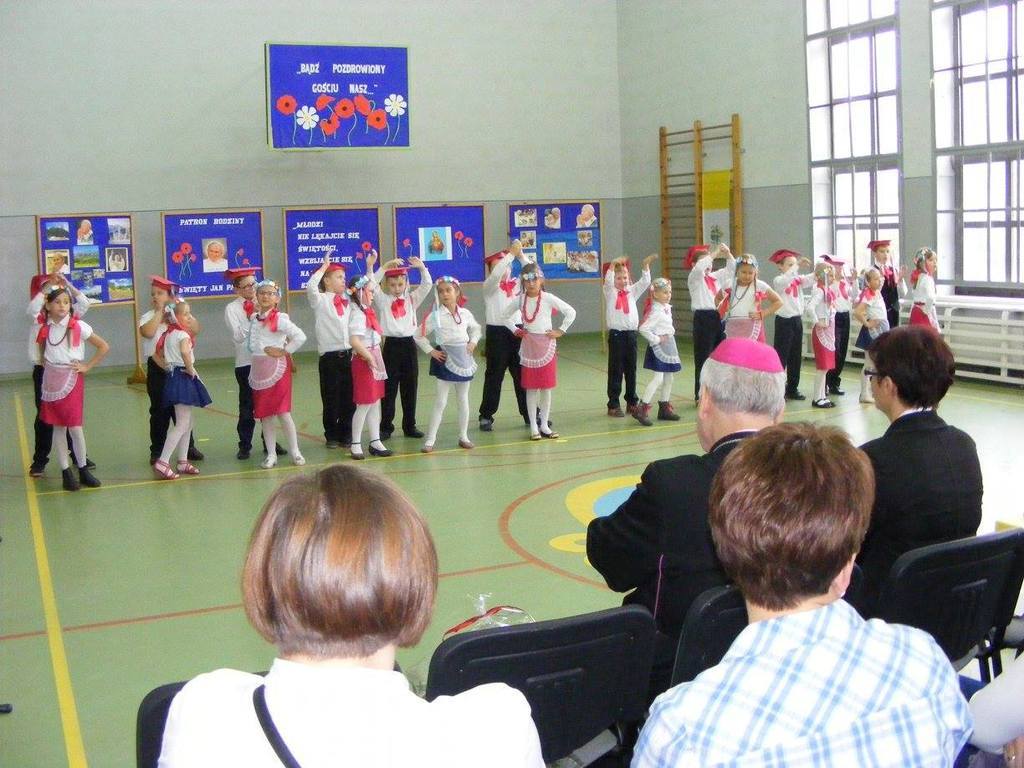 SIĘ TAŃCEM KRAKOWIAK W WYKONANIU UCZNIÓW KLASY II. DŁUGO BĘDZIEMY PAMIĘTAĆ PEŁNE SERDECZNOŚCI , DOBROCI I HUMORU SPOTKANIE Z KSIĘDZEM BISKUPEM.