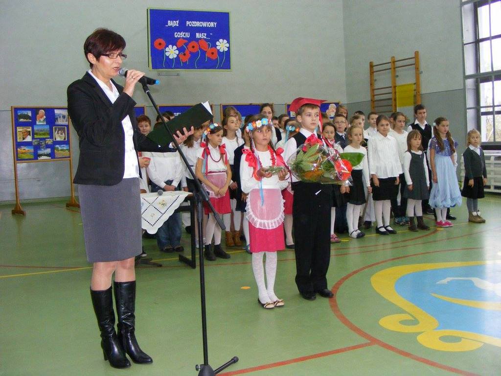 PANI DYREKTOR JOLANTA ZMYŚLONA SERDECZNIE POWITAŁA PRZYBYŁEGO GOŚCIA A UCZNIOWIE WRĘCZYLI KWIATY I SKIEROWALI SŁOWA RADOŚCI I WDZIĘCZNOŚCI.
