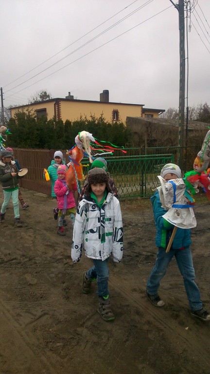 Świętowanie 21 marca rozpoczął finał konkursu recytatorskiego pod hasłem „Wiosna”. Uczniowie z klas I-III pięknie zaprezentowali się przed koleżankami i kolegami z całej szkoły, a wesołe, wiosenne teksty przywołały uśmiechy na naszych twarzach. Pierwszoklasiści powitali wiosnę piosenką „Maszeruje wiosna” i zaczęliśmy ustawiać kolorowy, głośny korowód do marszu przez wieś.