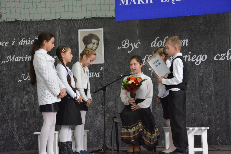 Pierwsza głos zabrała Pani Dyrektor Jolanta Zmyślona, która podziękowała gościom, że zechcieli przyjąć zaproszenie na jubileusz. Odnosząc się do historii szkoły Pani Dyrektor wspomniała, jak ważna była praca związana z wyborem patrona. Mówiła, o popularyzowaniu wśród uczniów wiedzy o życiu i twórczości Marii Dąbrowskiej i o tym, że motto szkoły, przez te wszystkie lata, było i jest drogowskazem dla wielu pokoleń naszych wychowanków, pedagogów i pracowników szkoły – „Być dobrym dla drugiego człowieka”.