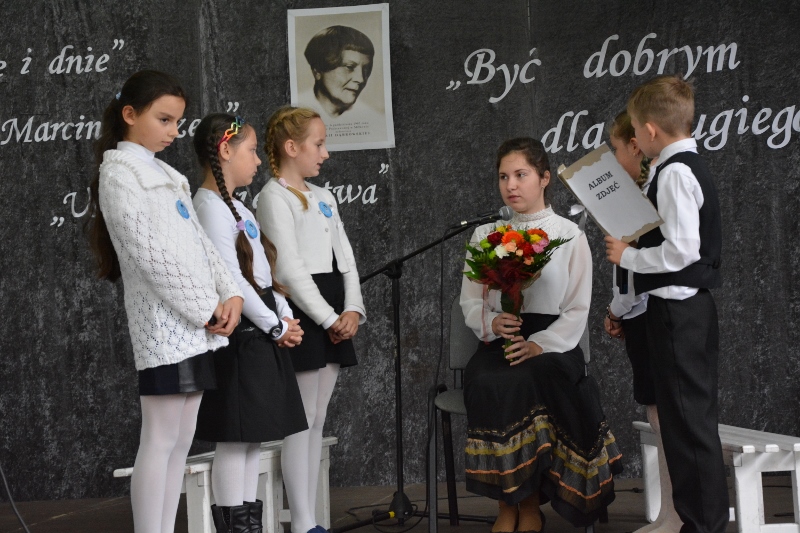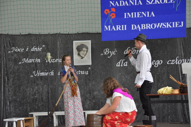 Druga część uroczystości należała do naszych uczniów i absolwentów, którzy zaprezentowali swoje umiejętności wokalne, aktorskie i taneczne. Z dużym talentem odegrali krótkie scenki z utworów Marii Dąbrowskiej, rozbawili wszystkich przedstawieniem ludowym ukazującym życie i obyczaje dawnej wsi polskiej, wzruszali do łez nostalgicznymi piosenkami, udowodnili, że walc jest tańcem, którego może nauczyć się i tańczyć prawie każdy. Zasłużenie zbierali pochwały i gratulacje.