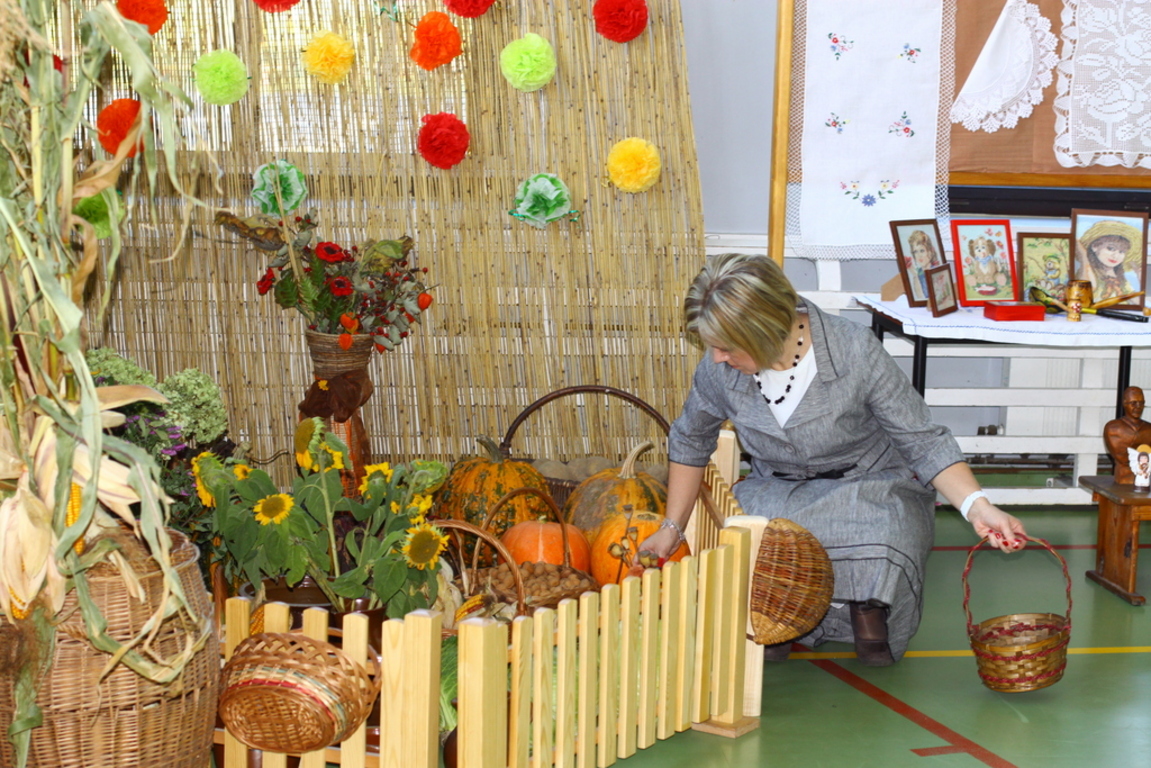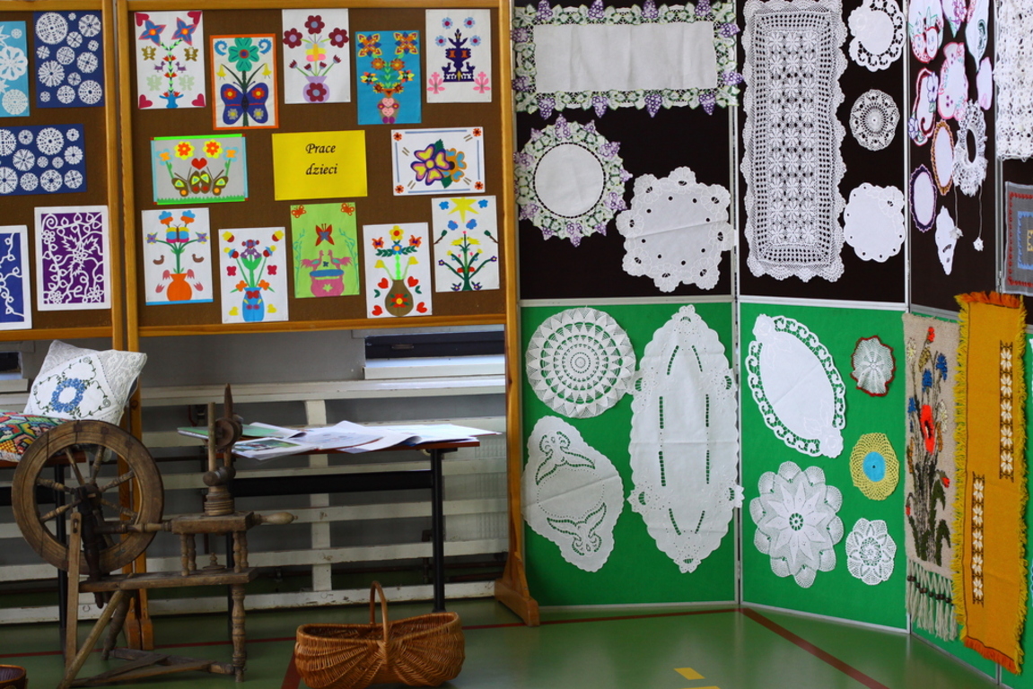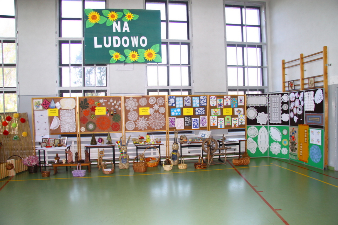 Nasza sala gimnastyczna z okazji Święta Szkoły przemieniła się w wystawę rękodzieła ludowego i wzbudzała podziw licznie zaproszonych gości z Wójtem Gminy Lubasz na czele oraz przybyłych rodziców.