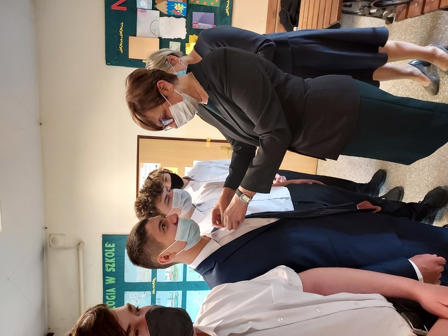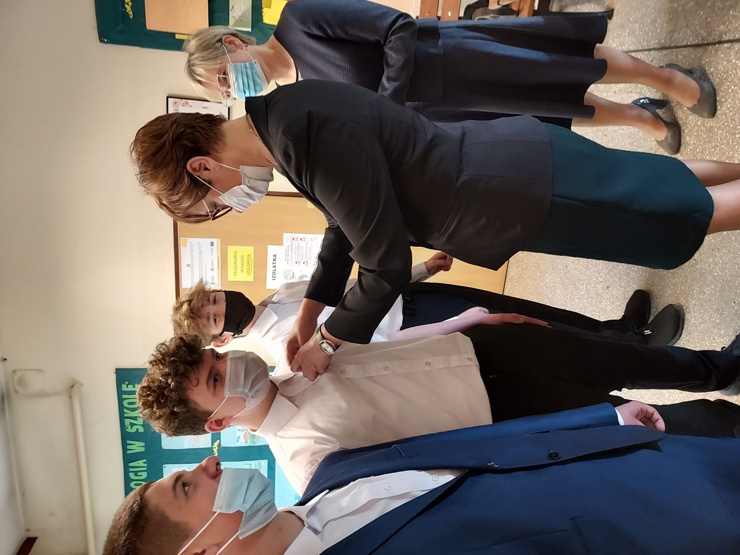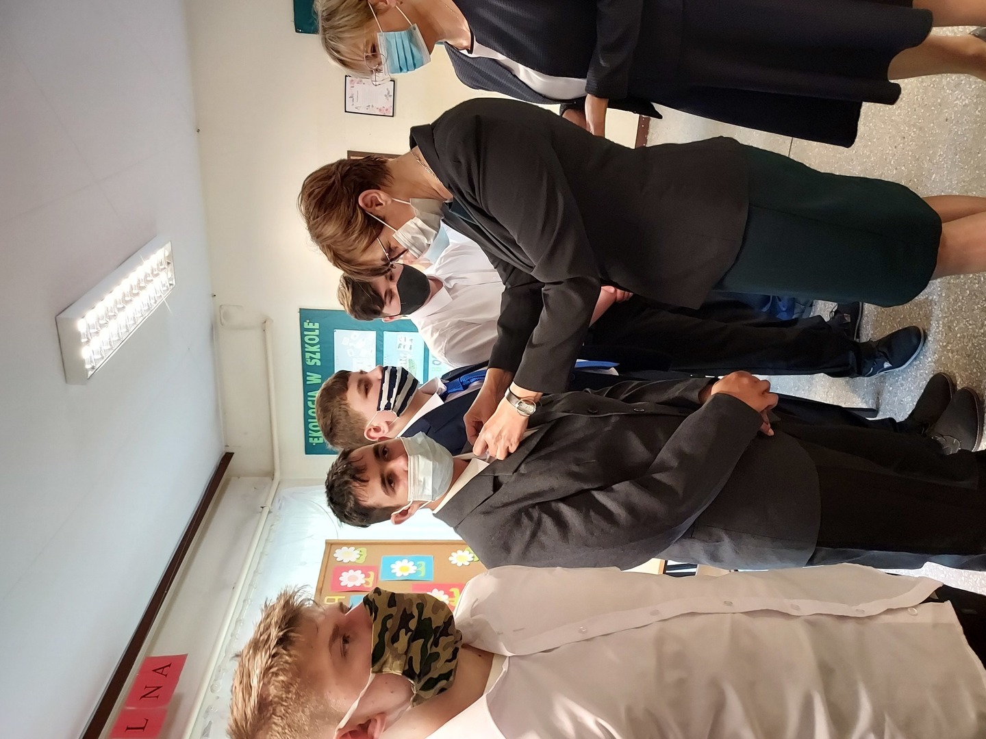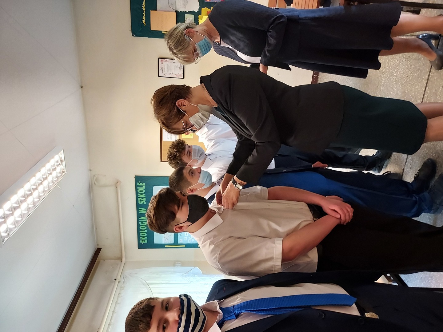 Wręczenie przez Panią dyrektor Jolantę Zmyśloną „Podkówek na szczęście” uczniom kl. VIII w dniu pierwszego egzaminu ósmoklasisty.