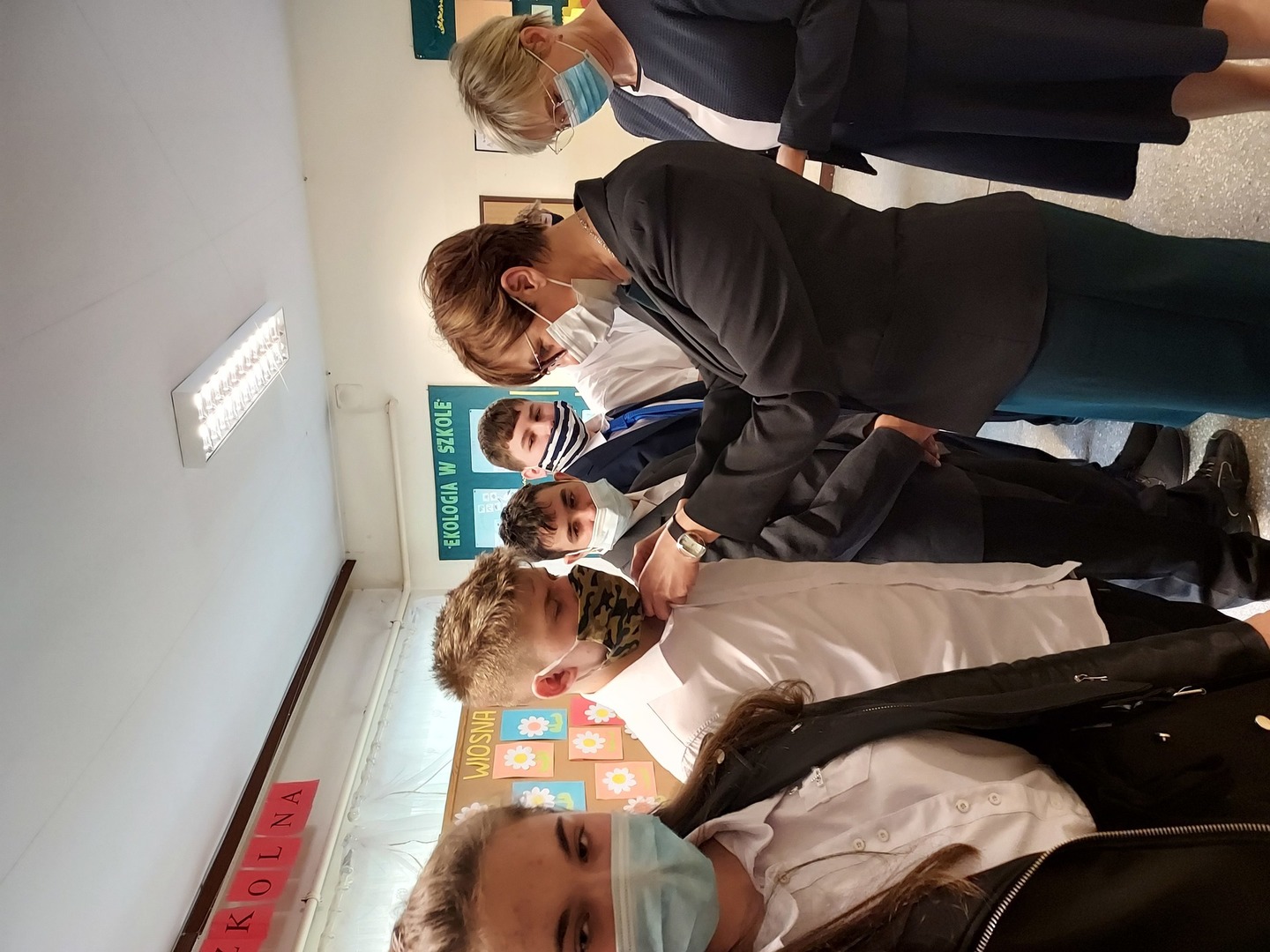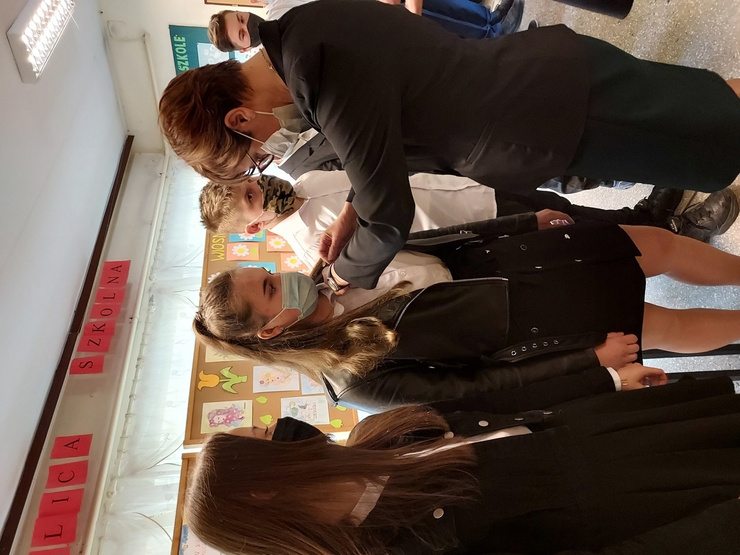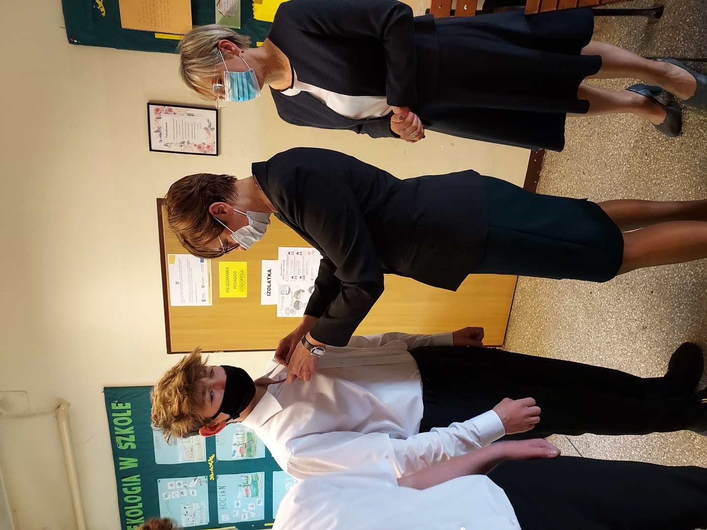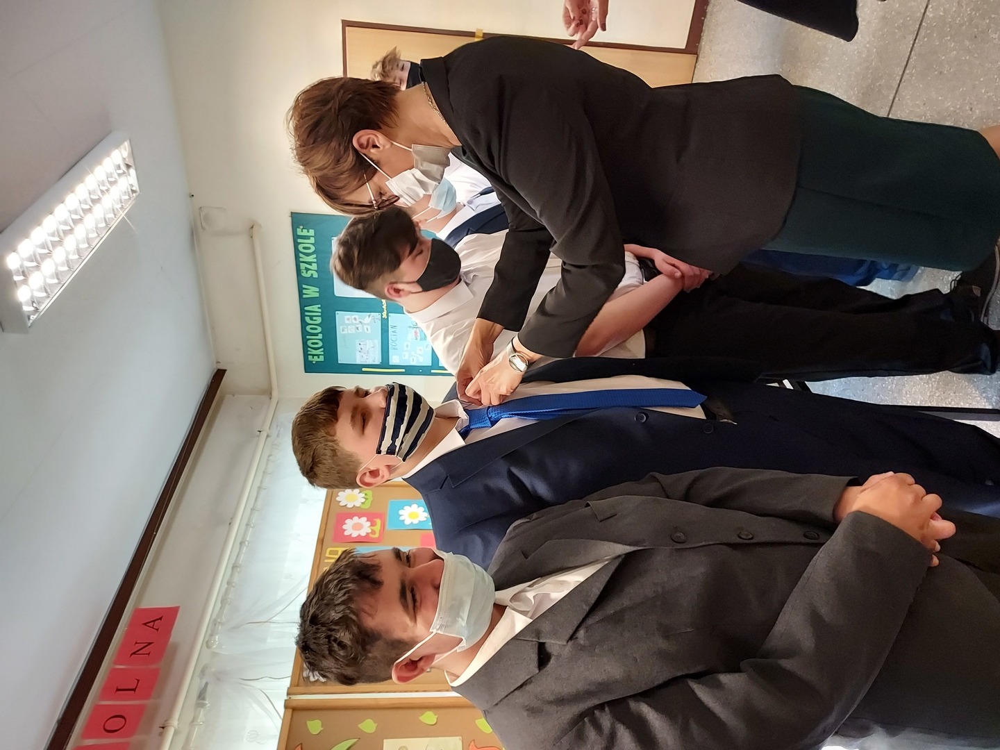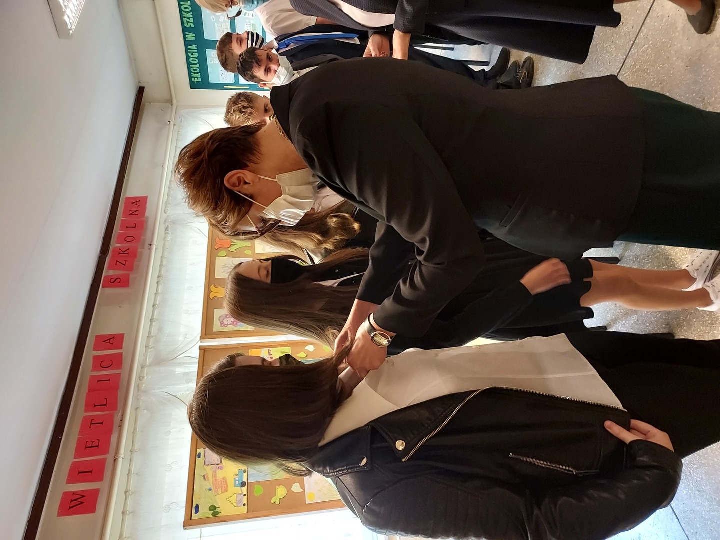 Wręczenie przez Panią dyrektor Jolantę Zmyśloną „Podkówek na szczęście” uczniom kl. VIII w dniu pierwszego egzaminu ósmoklasisty.