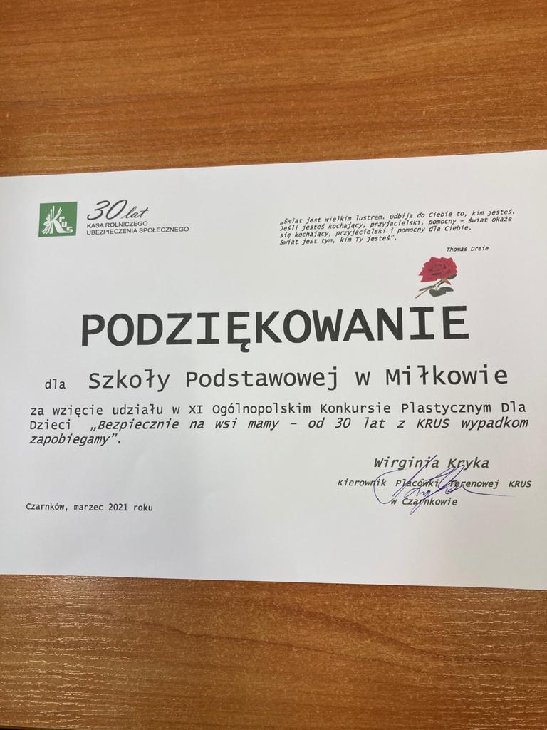 Podziękowanie za udział w konkursie plastycznym „Bezpiecznie na wsi mamy – od 30 lat z KRUS wypadkom zapobiegamy”.