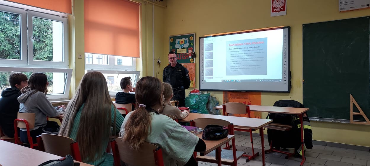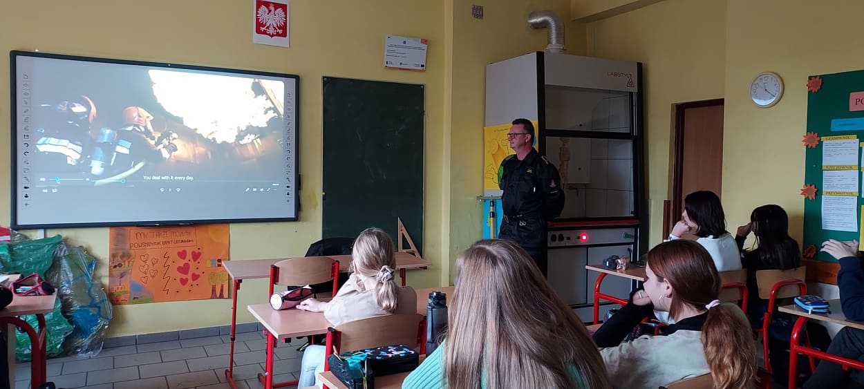 Uczniowie mogli dowiedzieć się o wymaganiach, jakie stawia przed nimi służba w szeregach Państwowej Straży Pożarnej.Nasz gość opowiedział, co trzeba zrobić, żeby nim zostać i czym tak naprawdę się zajmuje. A było o czym mówić, bo jest to jedna z najważniejszych profesji, która postępuje zgodnie z etosem, który przypomniał Pan Piotr: „Bogu na chwałę, ludziom na ratunek".Spotkanie miało również na celu kształtowanie czynnych postaw prospołecznych wśród młodzieży, odpowiedzialności, niesienia pomocy w sytuacjach zagrożenia życia i zdrowia poszkodowanych.