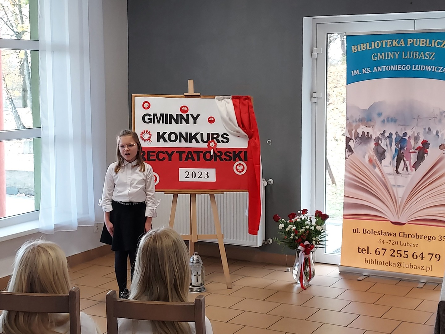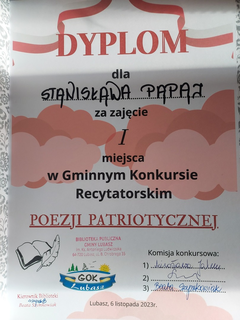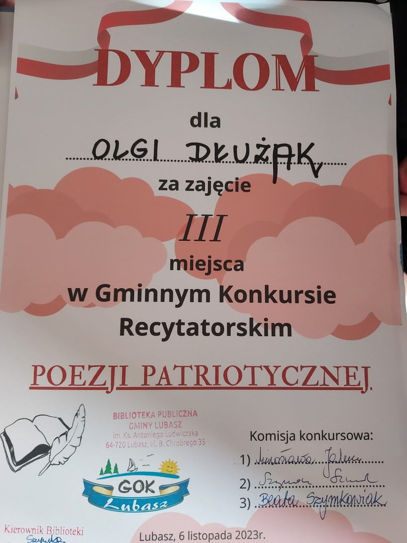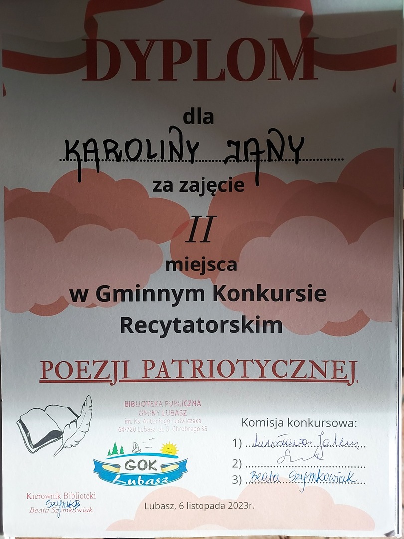 6 listopada br. uczniowie naszej szkoły wzięli udział w Gminnym Konkursie Recytatorskim o tematyce patriotycznej. Naszą placówkę reprezentowali: Karolina Jany, Olga Dłużak, Stanisław Papaj i Judyta Sotek.