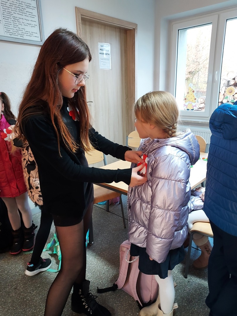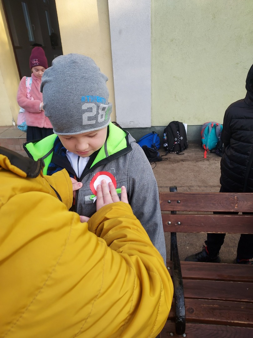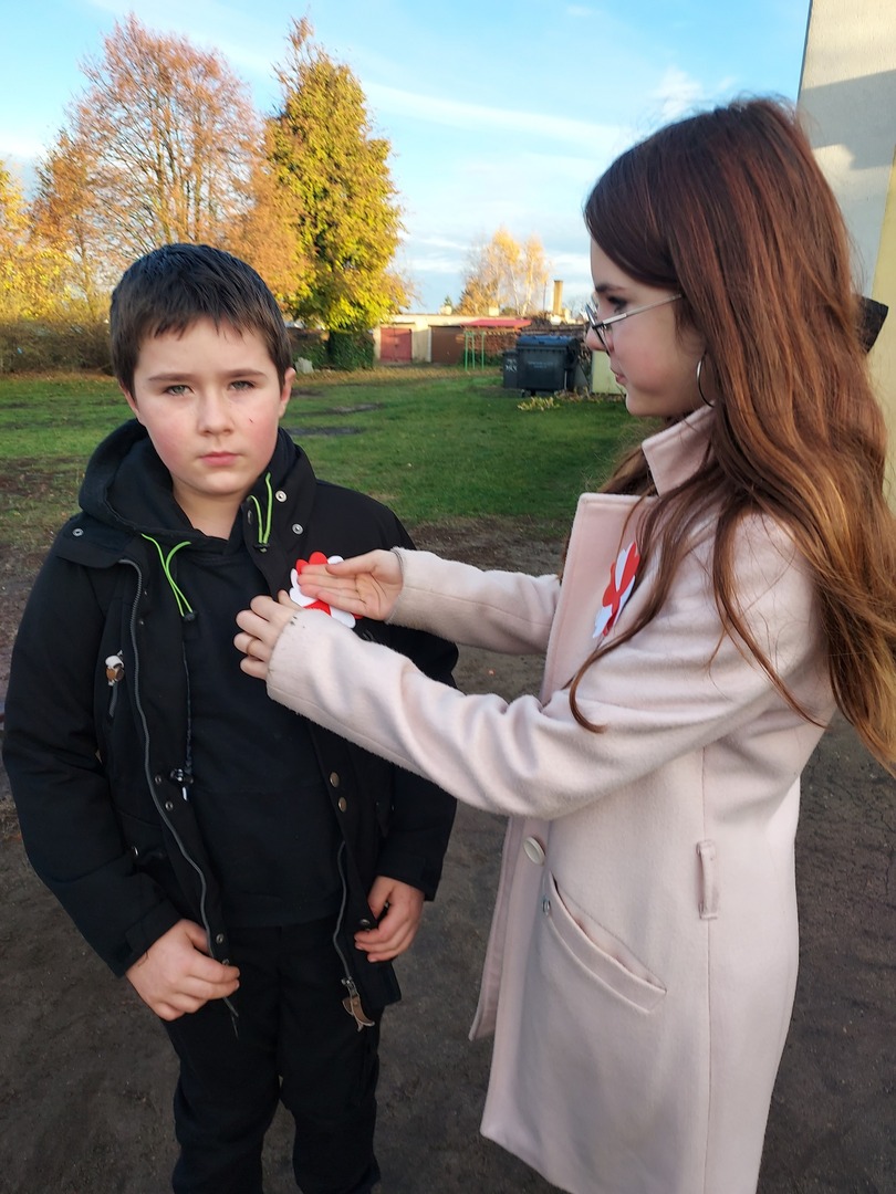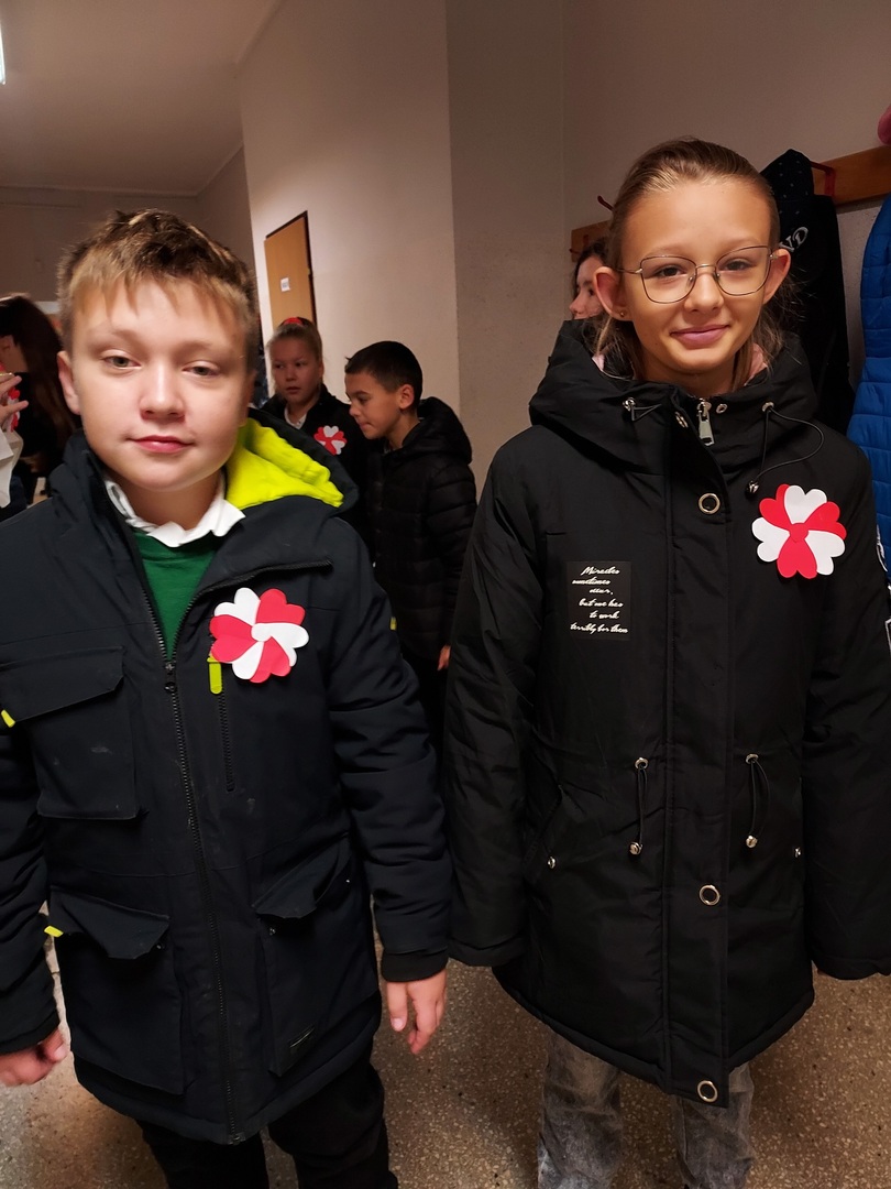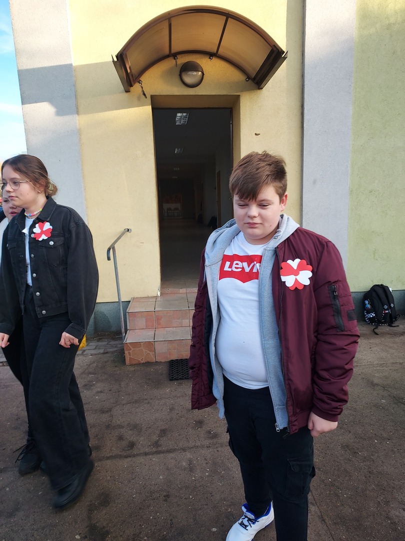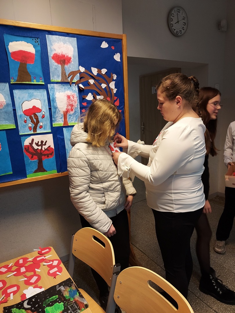Członkowie Szkolnego Koła Wolontariatu zadbali, aby biel i czerwień - barwy narodowe były widoczne na ubraniach całej społeczności szkolnej🤍❤