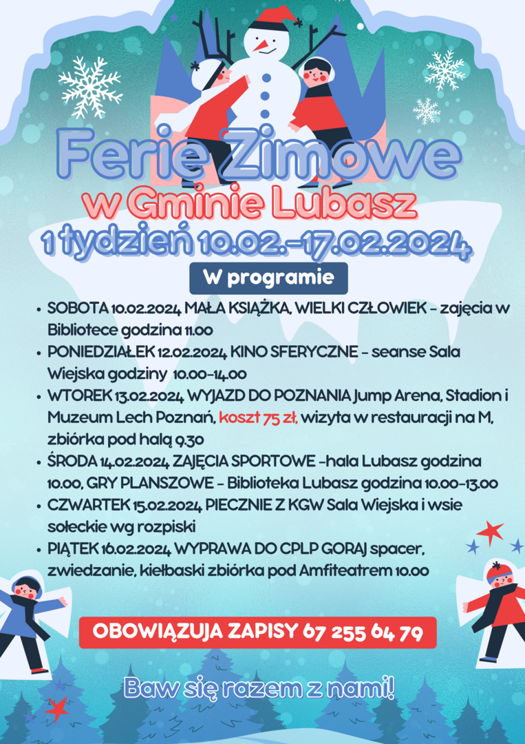 Zapraszamy do zapoznania się z ofertą zajęć, przygotowaną na czas zimowego wypoczynku. Poza wyjazdami do Poznania, pozostałe atrakcję są bezpłatne. Prosimy jednak o zapisywanie się na poszczególne wydarzenia pod numerem telefonu 67 255 64 79 Biblioteka Publiczna Gminy Lubasz im. ks. Antoniego Ludwiczaka.