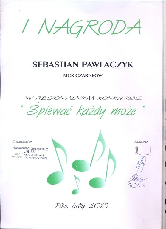 W sobotę 16 lutego 2013 roku w Pile odbył się Regionalny Konkurs "Śpiewać każdy może", w którym nasz uczeń Sebastian Pawlaczyk zdobył I miejsce. Serdecznie gratulujemy i życzymy dalszych sukcesów.