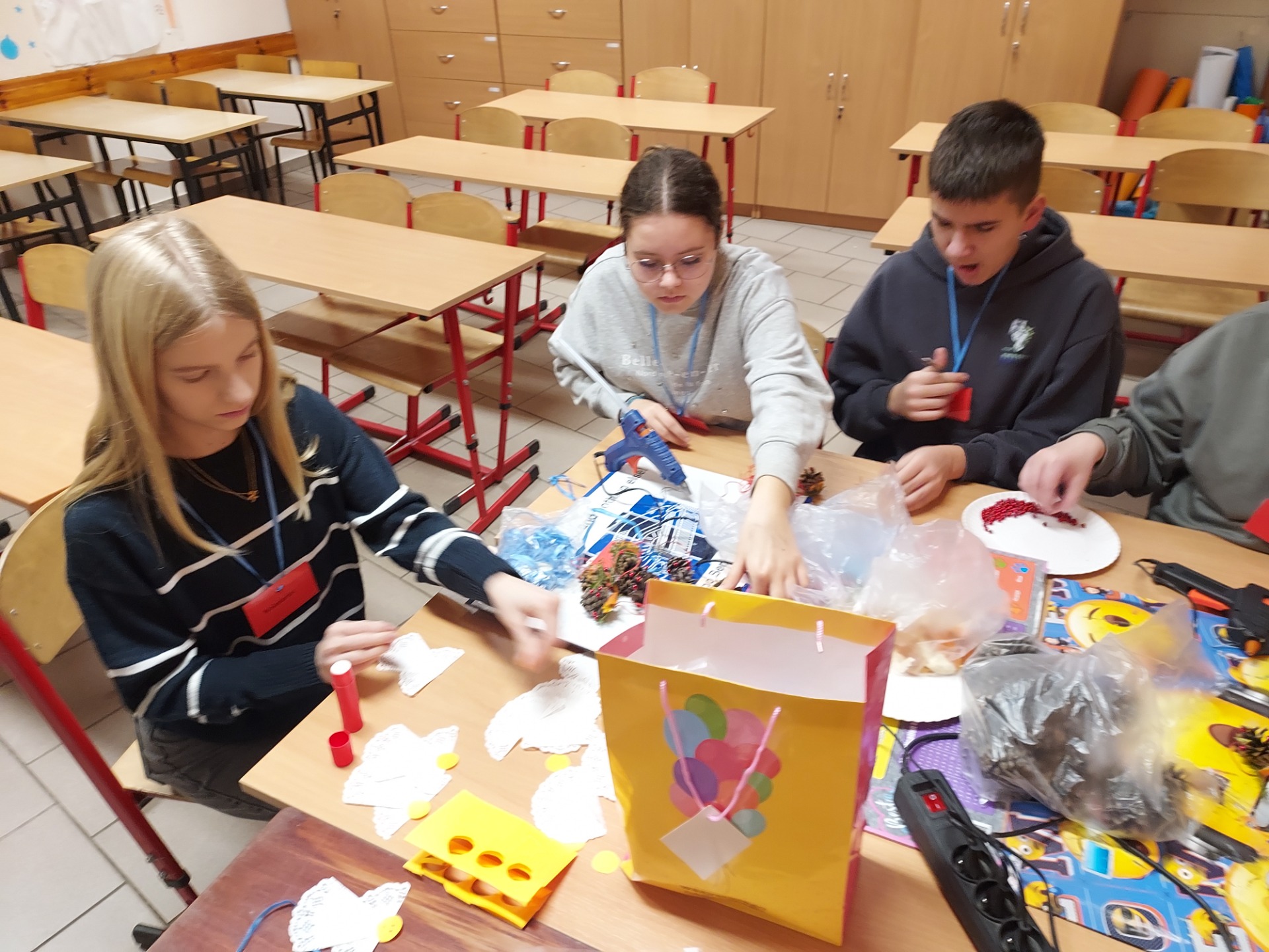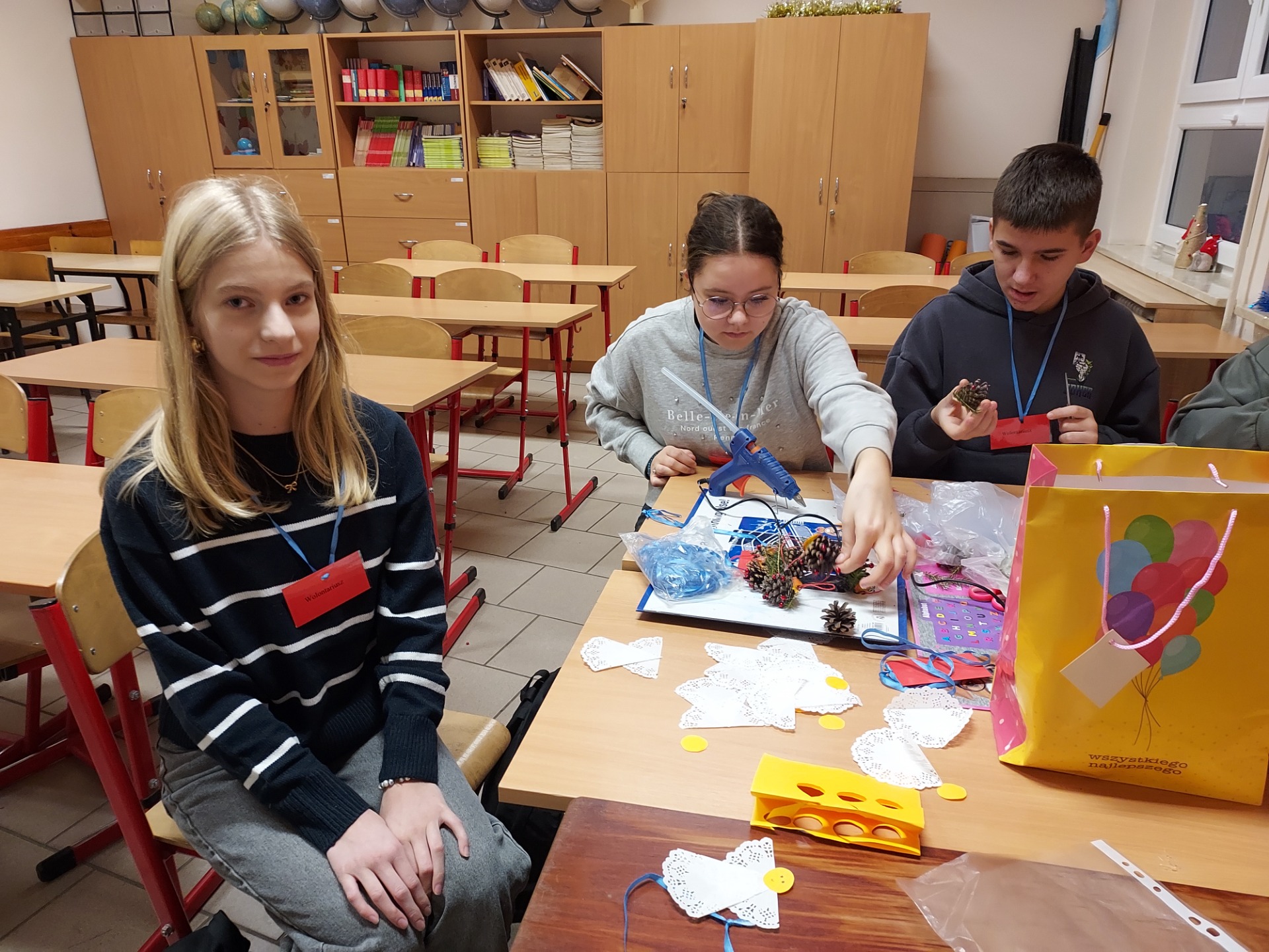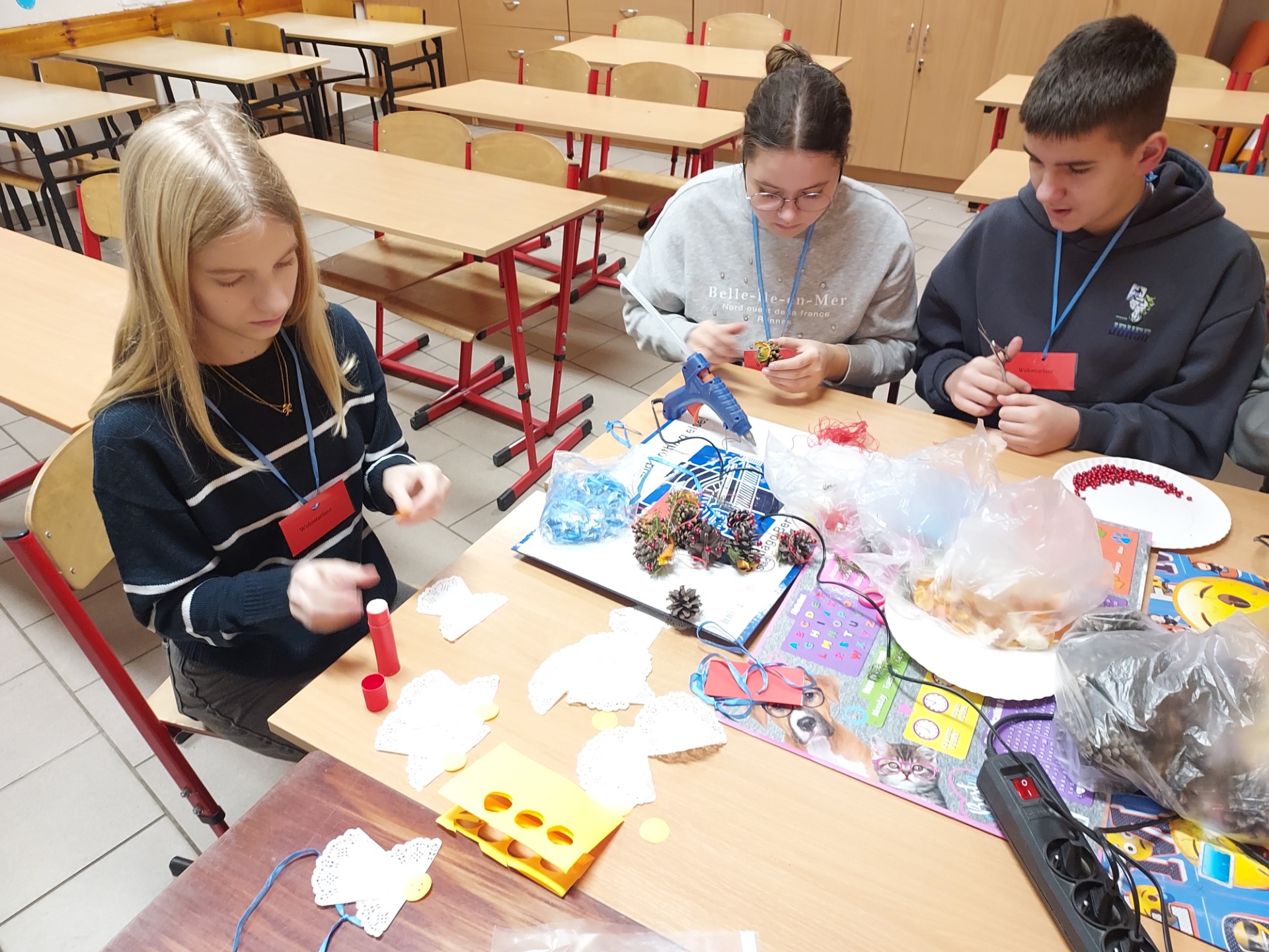 🌲🌲🌲Zaangażowanie uczniów i wolontariuszy w wykonanie ozdób choinkowych, które przyozdobią drzewko na kiermaszu świątecznym przed biblioteką w Lubaszu🌲🌲🌲