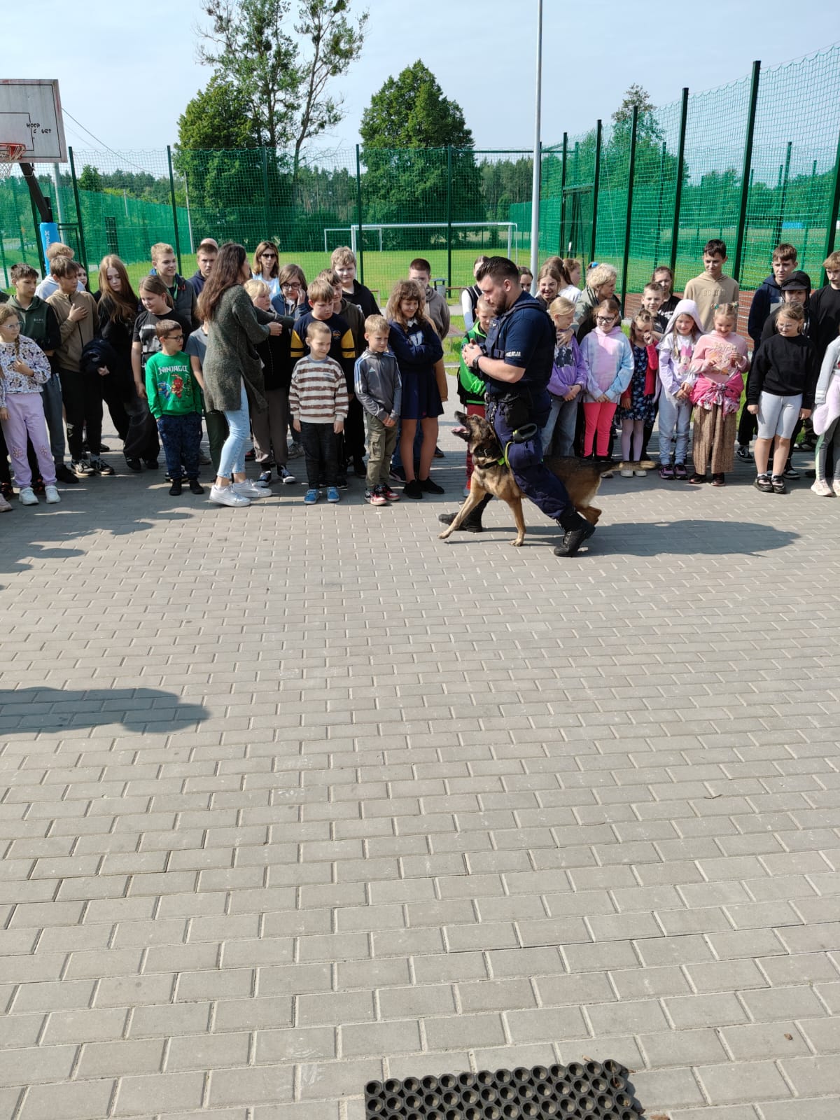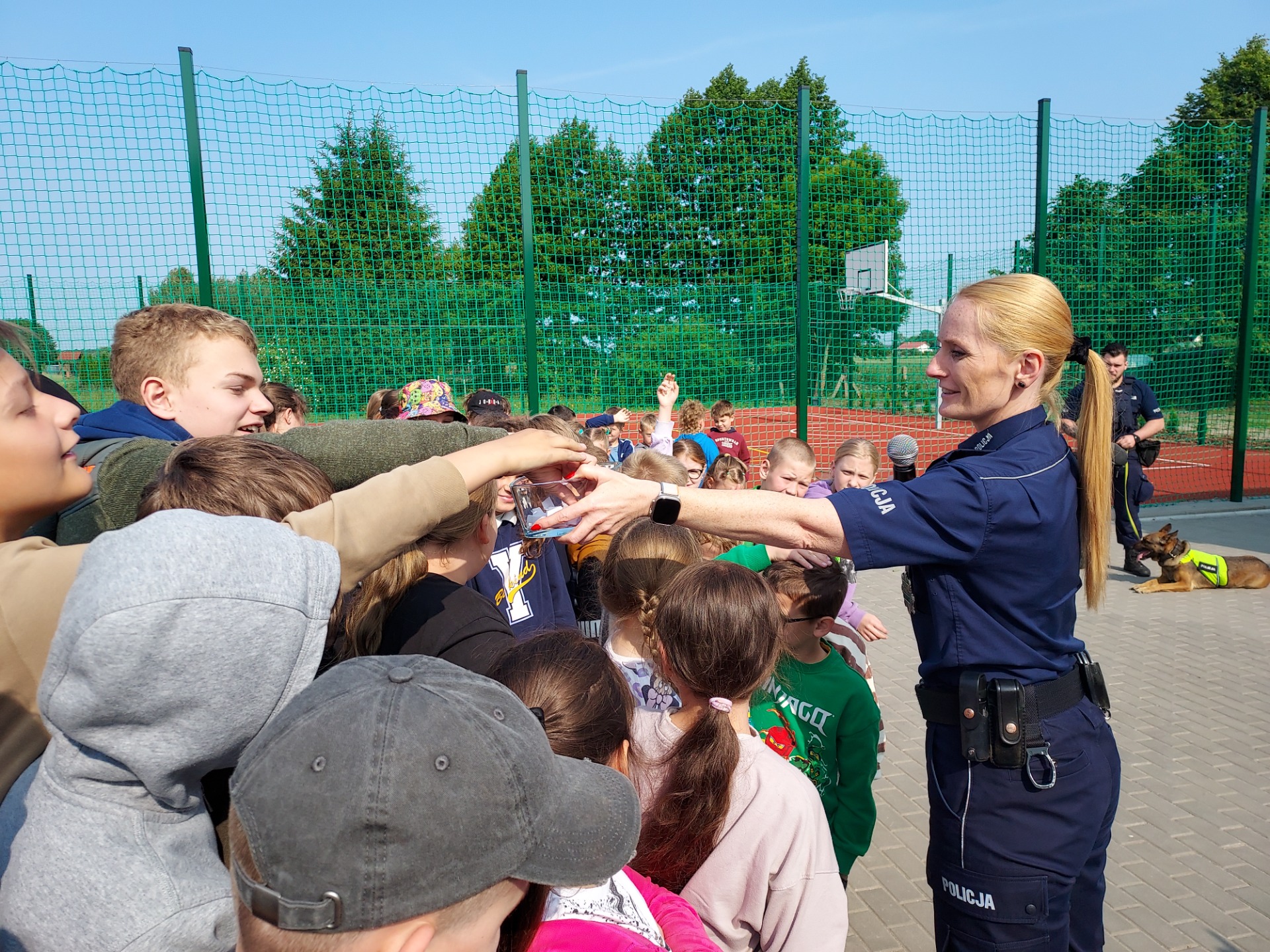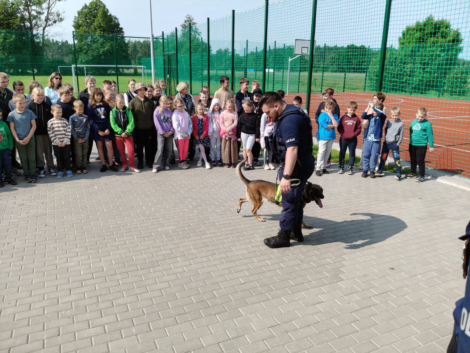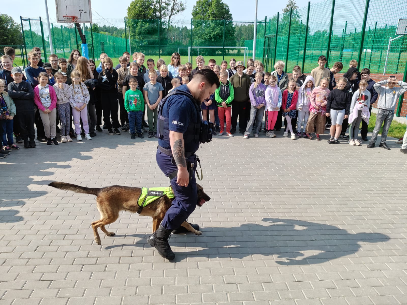 Podczas pogadanki uczniowie aktywnie uczestniczyli w zajęciach – losowali pytania związane z bezpieczeństwem i wspólnie udzielali odpowiedzi pod czujnym okiem funkcjonariuszy. Największą atrakcją spotkania był jednak policjant z psem służbowym. Uczniowie z ogromnym zainteresowaniem wysłuchali opowieści o pracy psa policyjnego o imieniu Cina.