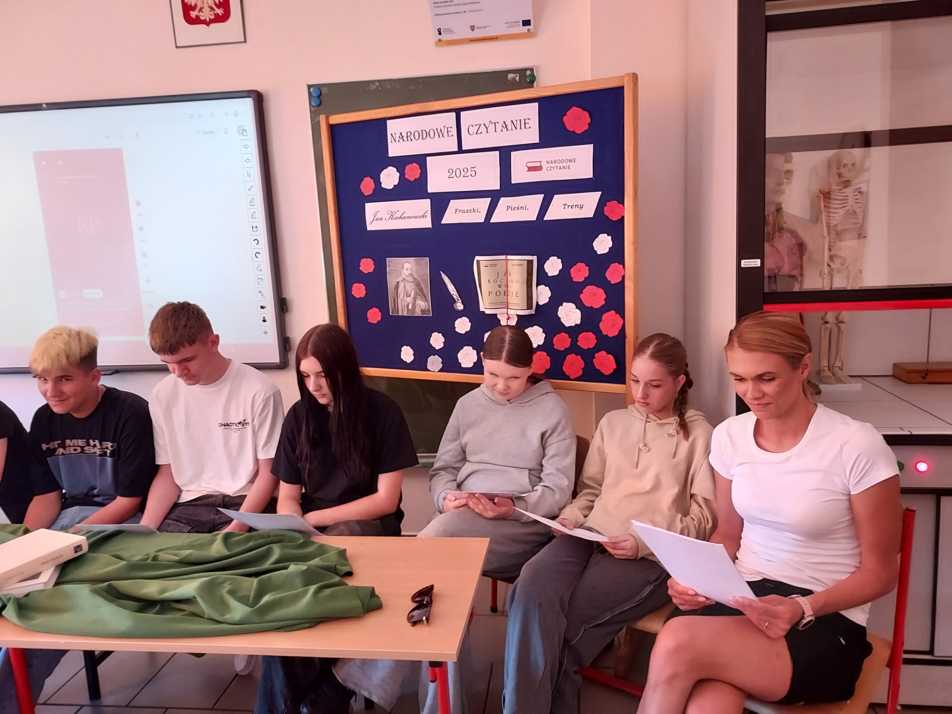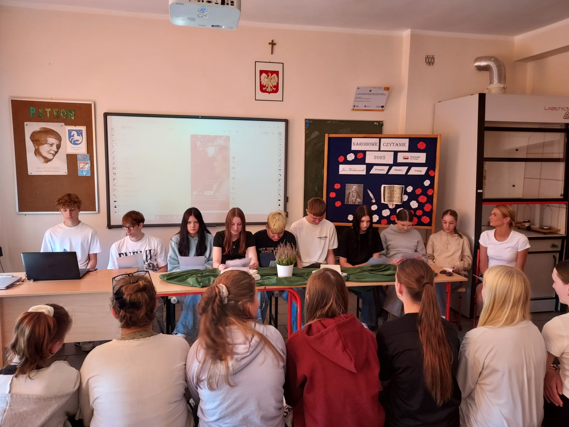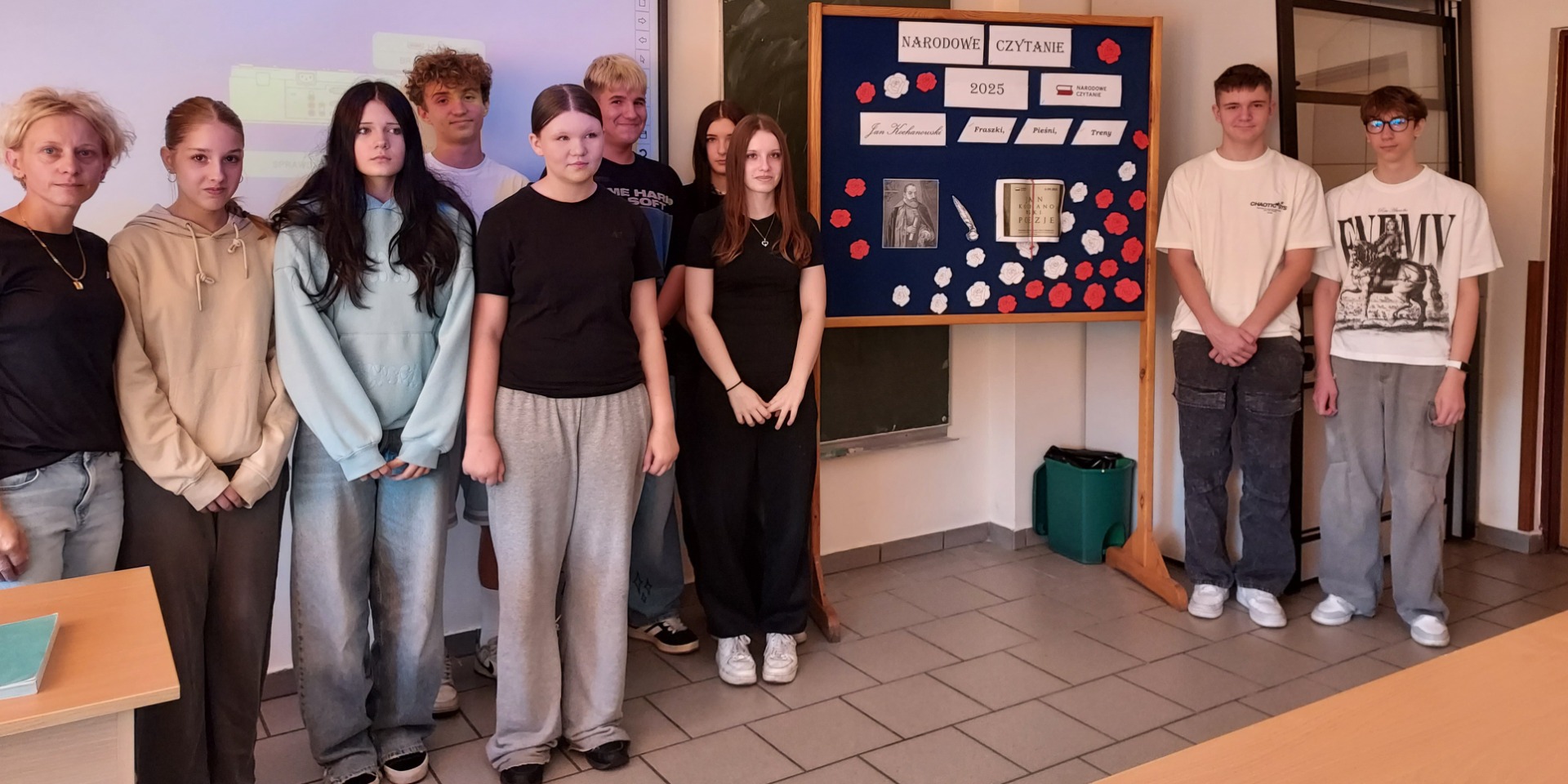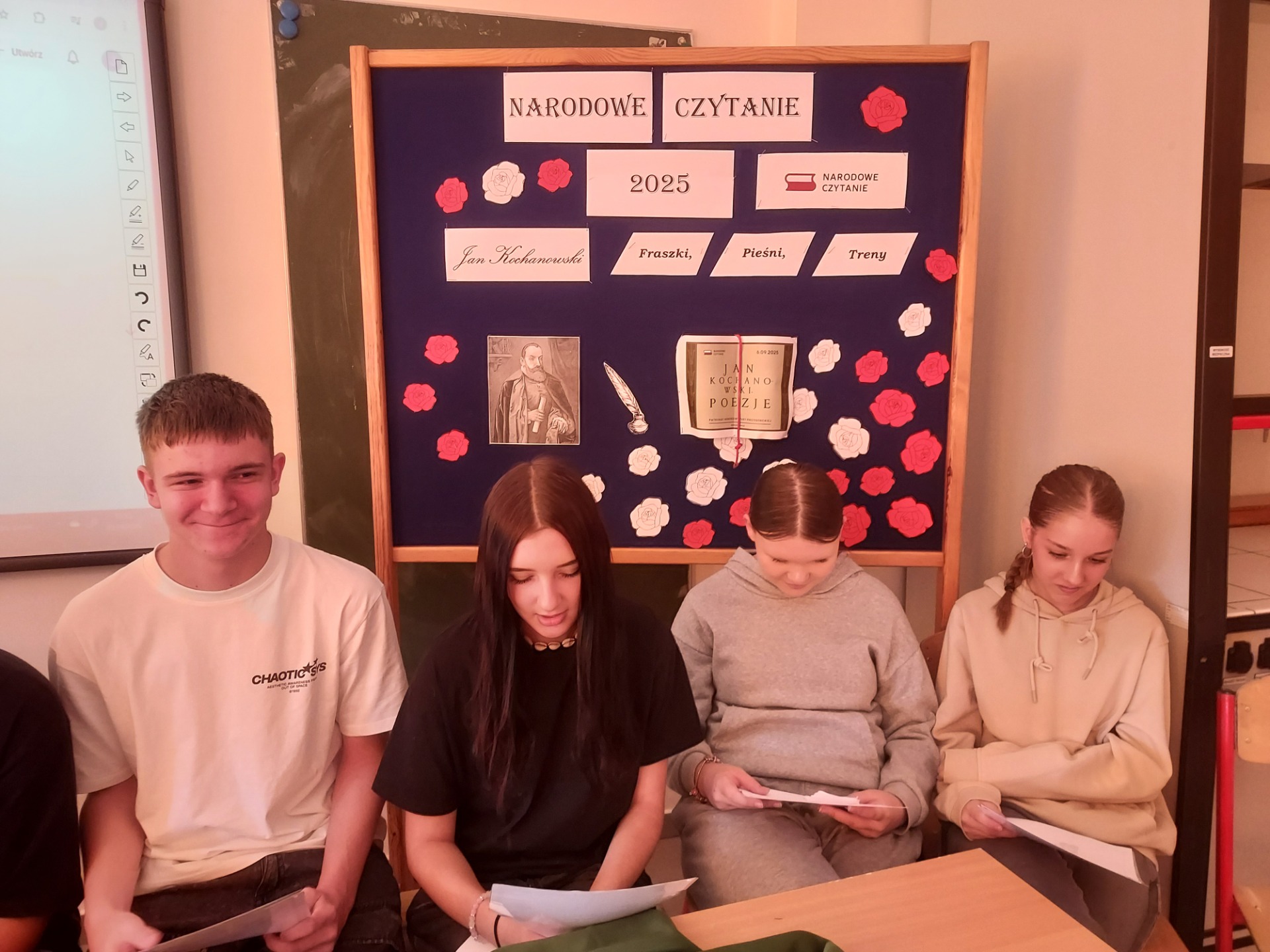 Uczniowie klasy VIII wspólnie z panią Mileną Skorupińską aktywnie włączyli się w obchody Narodowego Czytania poezji Jana Kochanowskiego. Wydarzenie to stało się okazją do spotkania z literaturą i pogłębienia wiedzy o twórczości jednego z najwybitniejszych poetów polskiego renesansu. Podczas tegorocznej akcji uczestnicy zaprezentowali uczniom klasy VII wybrane utwory Jana Kochanowskiego, m.in. fragmenty fraszek, trenów i pieśni. Ich recytacje zostały przygotowane z dużym zaangażowaniem i starannością, co podkreślało nie tylko walory artystyczne tekstów, ale również ich ponadczasowe przesłanie. Udział w wydarzeniu był nie tylko formą uczczenia dorobku Jana Kochanowskiego, lecz także świadectwem, że młodzież chętnie angażuje się w inicjatywy promujące literaturę i tradycję narodową.